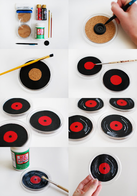 1. You'll need coasters, paint, brushes, Mod Podge Outdoor, a pencil, and something to trace around.